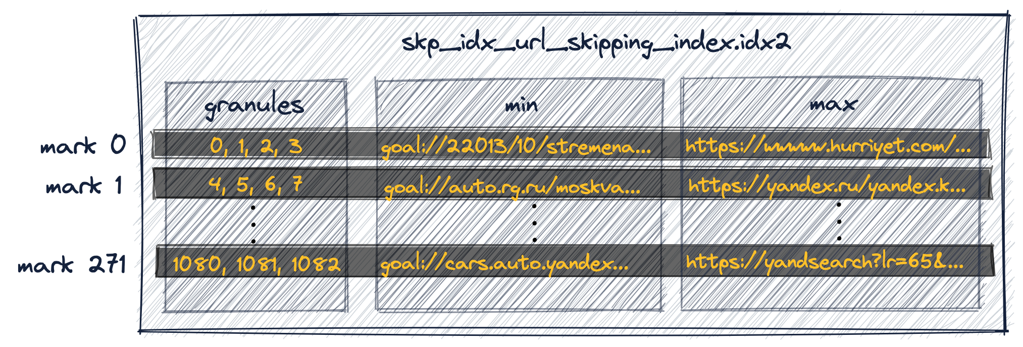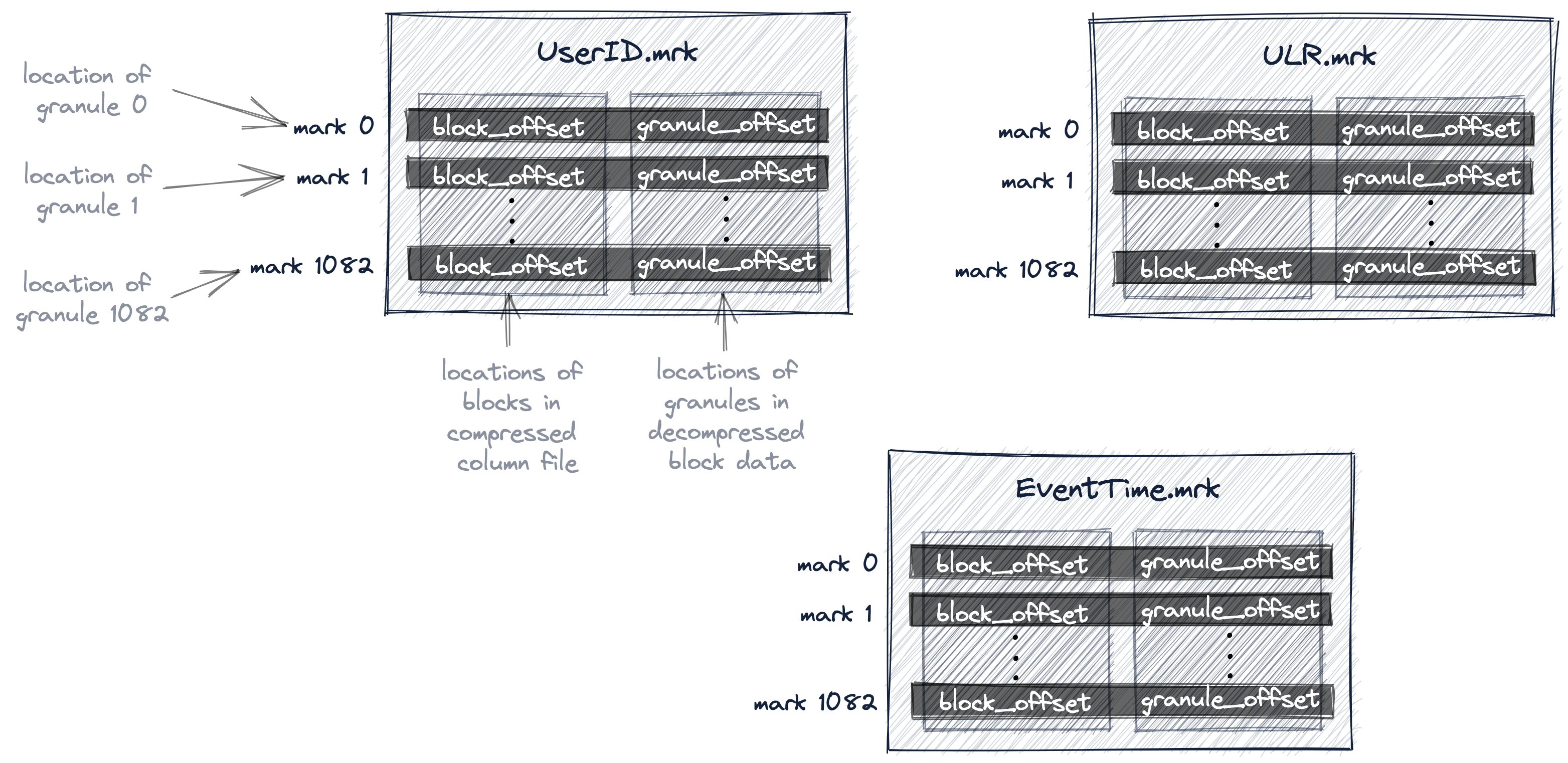 In ClickHouse the physical locations of all granules for our table are stored in mark files. Similar to data files, there is one mark file per table column.