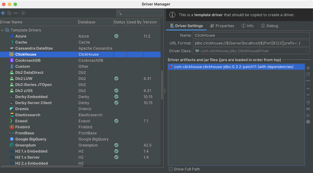 DbVisualizer has the most up-to-date JDBC drivers for ClickHouse included. It has full JDBC driver management built right in that points to the latest releases as well as historical versions for the drivers.